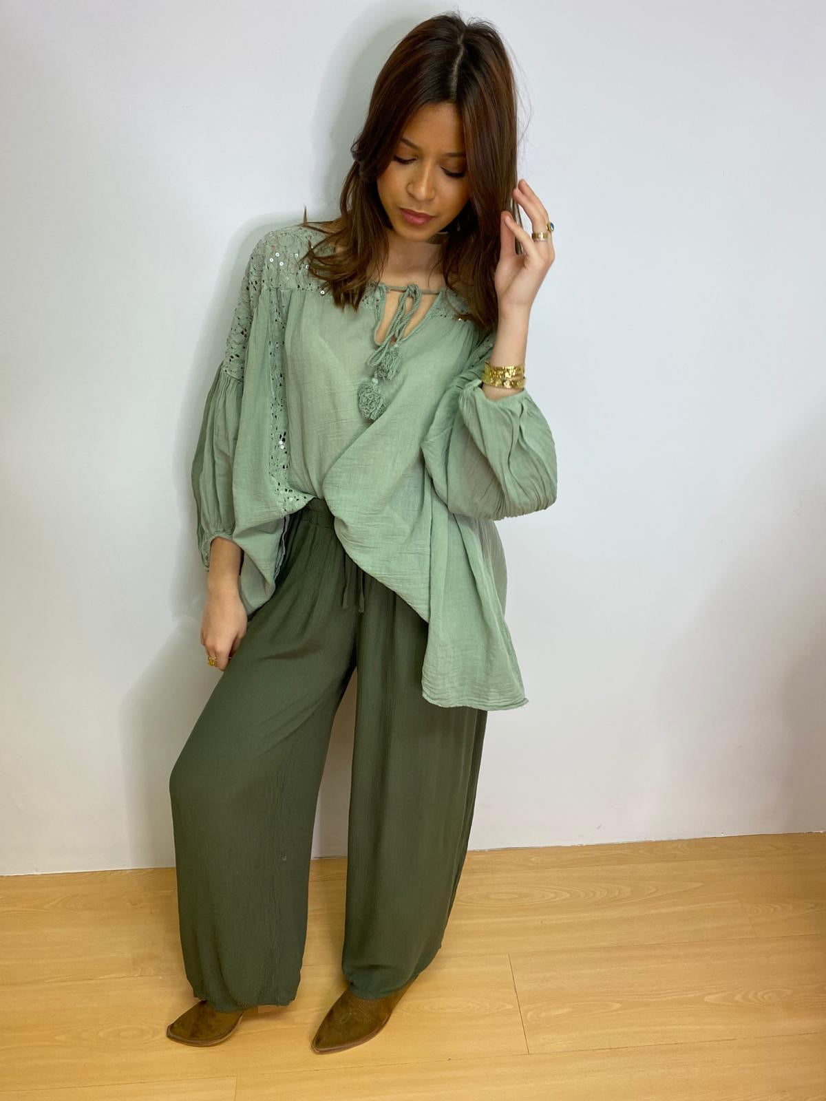 Nous utilisons du viscose fluide, du coton naturel et du lin de qualité, tous tissés en Italie. Des matières douces, respirantes et durables, pensées pour sublimer la silhouette tout en respectant ta peau — et la planète.