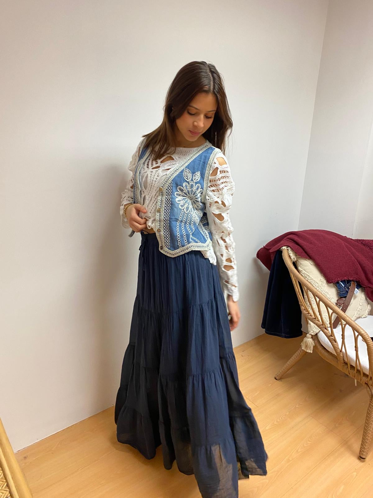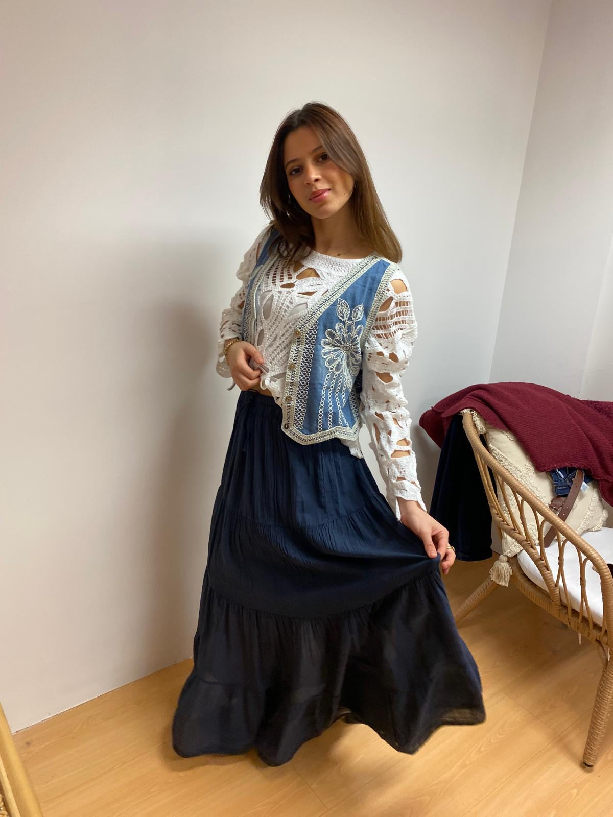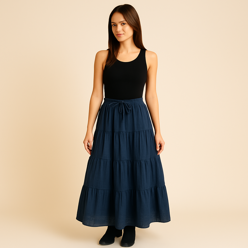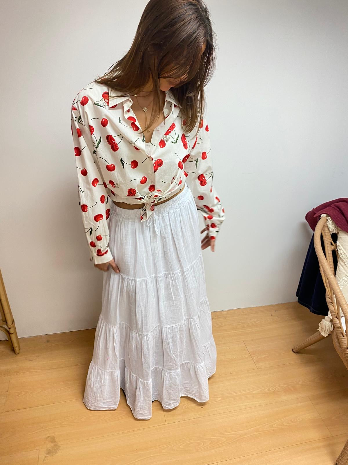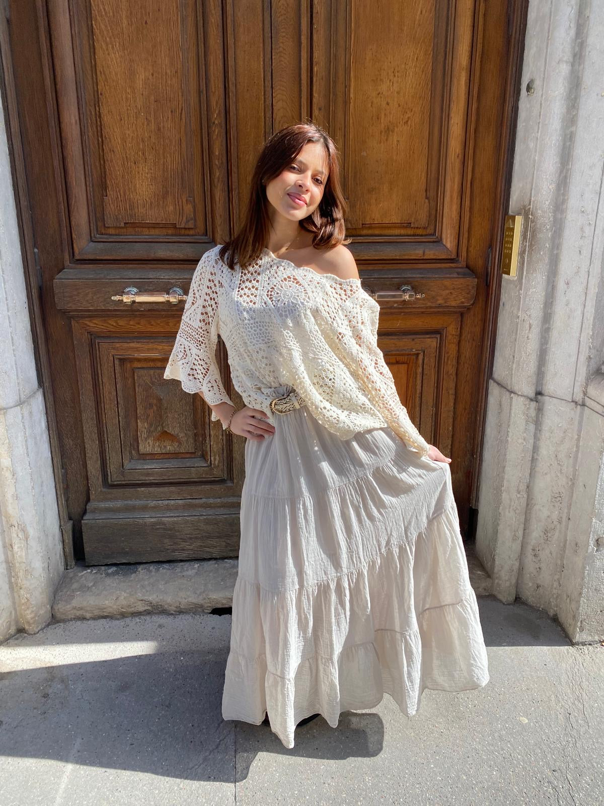 Notre jupe longue Écrue – confectionnée en Italie – célèbre la légèreté d’un coton pur et le charme d’un volume aérien. Une silhouette libre, au tombé naturellement élégant.