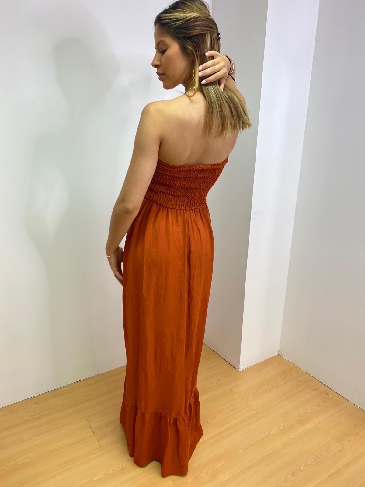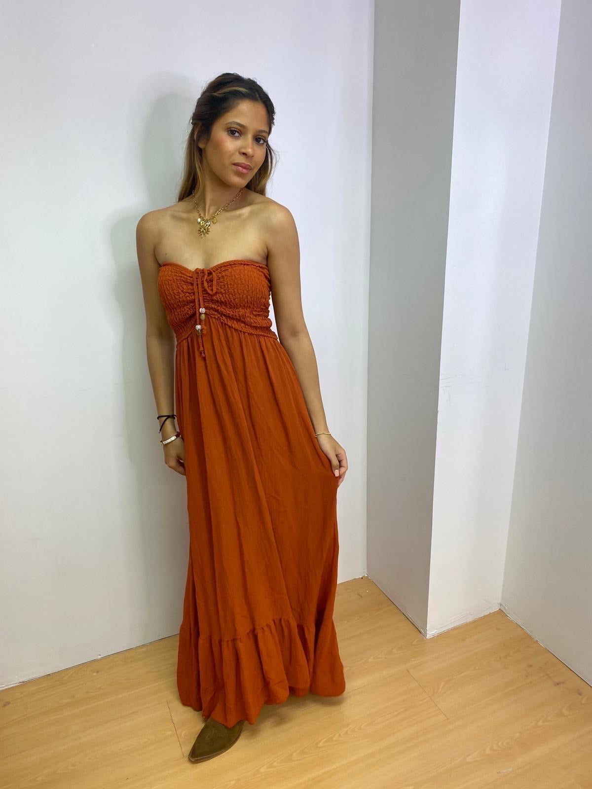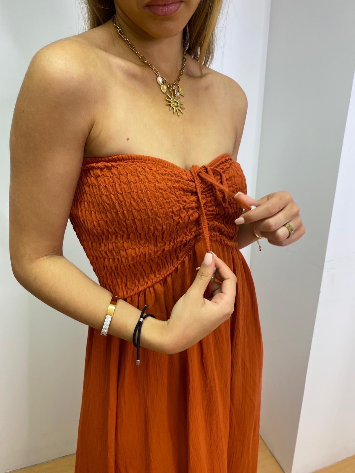 Notre robe bustier Terracotta – coupée en Italie – célèbre la liberté du mouvement et l’élégance d’un tombé naturel, sans effort