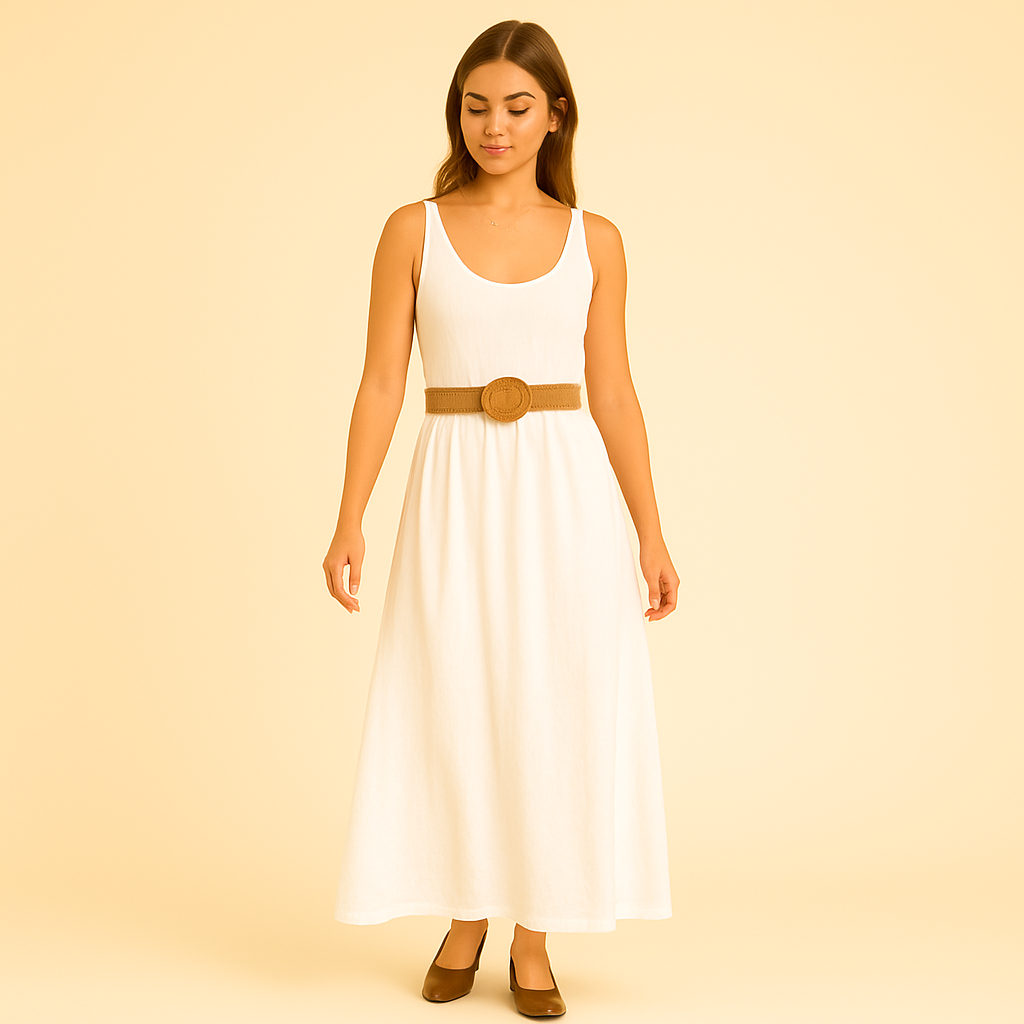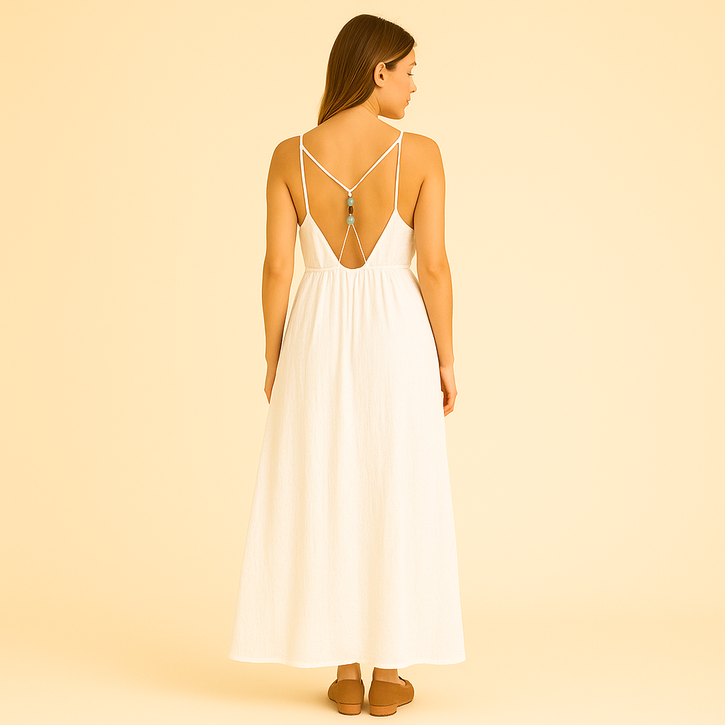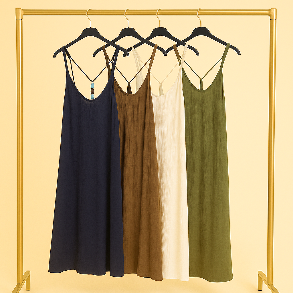Nous utilisons du viscose fluide, du coton naturel et du lin de qualité, tous tissés en Italie. Des matières douces, respirantes et durables, pensées pour sublimer la silhouette tout en respectant ta peau — et la planète.