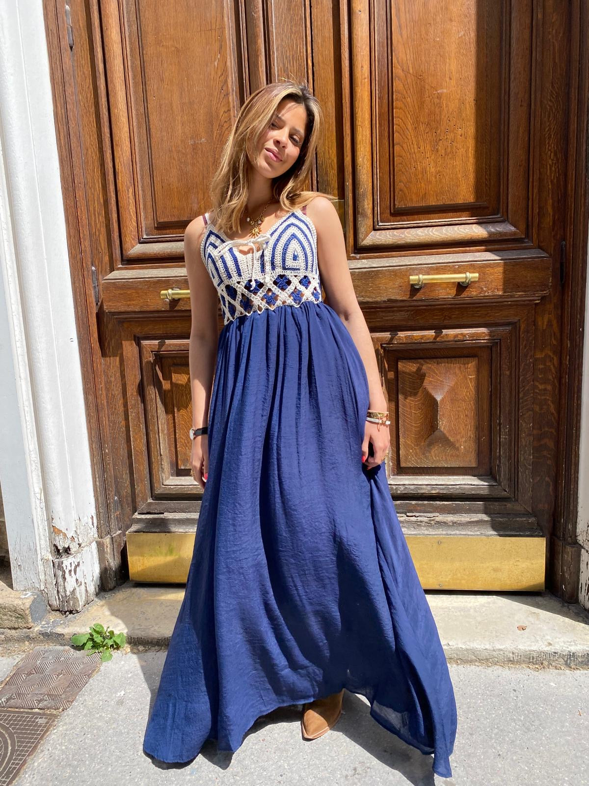 Notre robe brodée Made in Italy – entre contraste chic et fluidité estivale – incarne l’élégance solaire et la précision d’un tombé parfaitement maîtrisé.